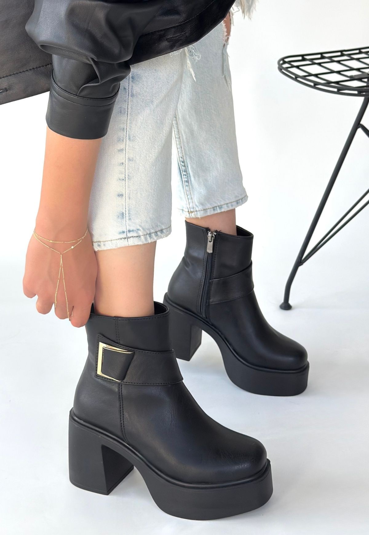 Lonji Siyah Cilt Topuklu Bot